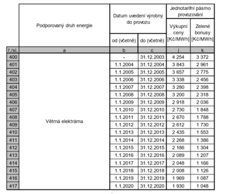 Cenové rozhodnutí Energetického regulačního úřadu č. 3/2019 ze dne 26. září 2019, kterým se stanovuje podpora pro podporované zdroje energie. Na základě vydaného cenového rozhodnutí se pro rok 2020 stanovuje Energetický regulační úřad pro větrné elektrárny níže uvedené ceny.